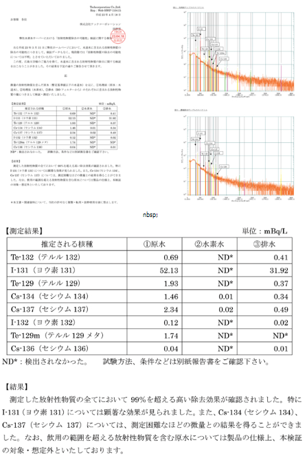 이는 전세계에서 유일한 역삼투압 필터 방식을 채용한 수소 정수기로 필터에서 1단계 및 전기분해에 의한 이온화와 그에 따른 2단계 제거 능력의 극대화로 방사능물질 제거 능력이 탁월한 결과로 추정하고 있습니다.